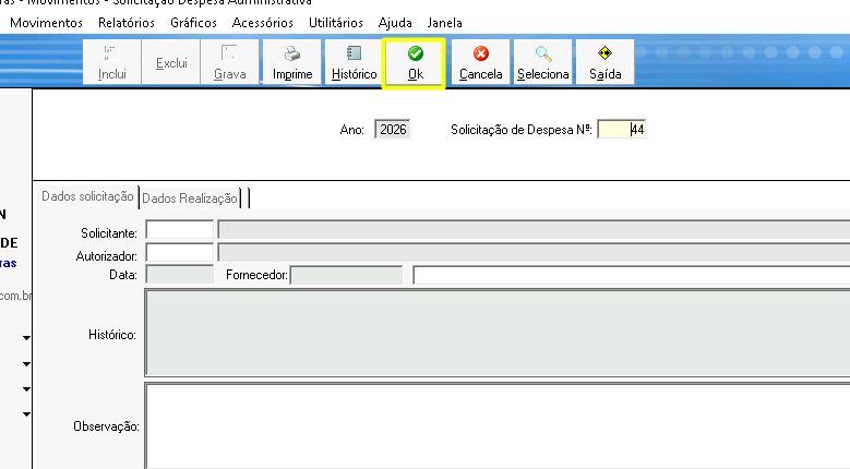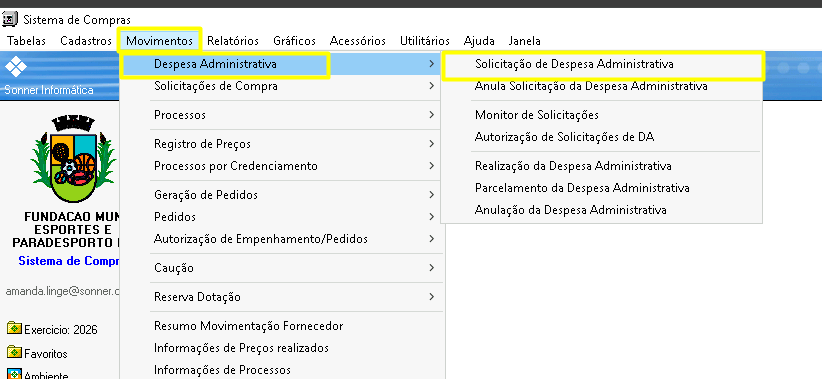 Siga o caminho: Movimentos > despesa administrativa > soliictação de despesa administrativa