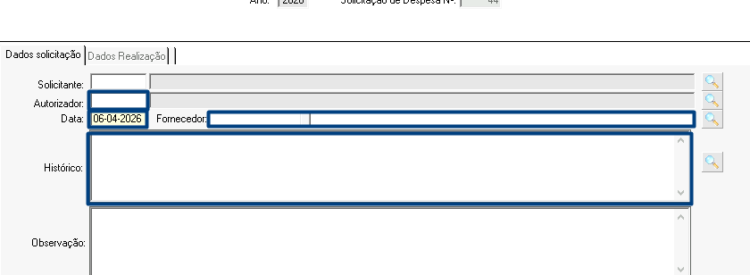 Preencha os campos: Autorizador, data, fornecedor, histórico