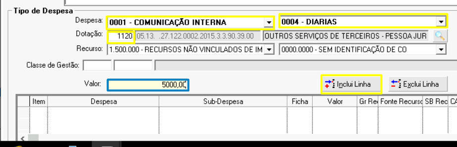 Preencha os campos: Despesa, dotação e valor. Incluir linha