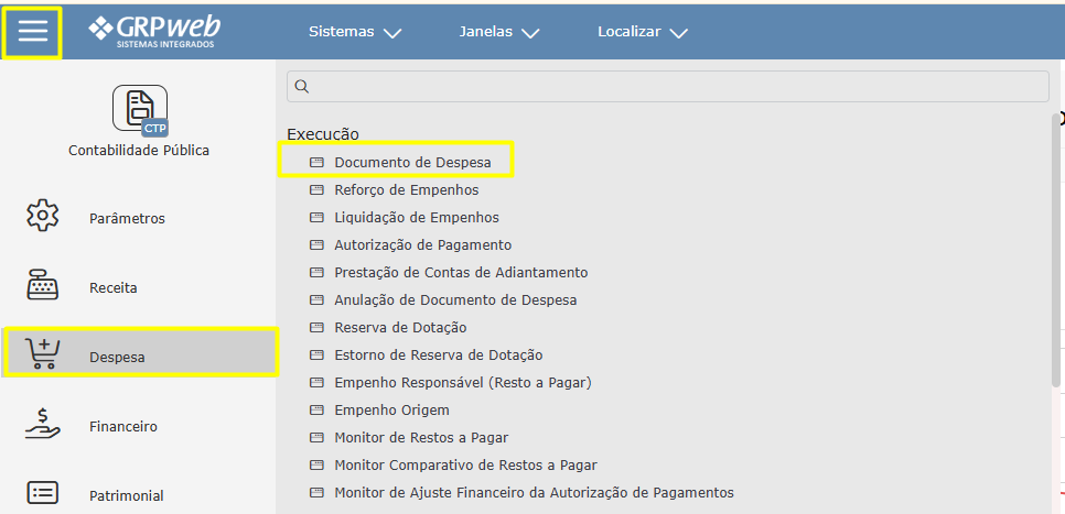 Após realizar login, acesse o sistema de contabilidade pública web