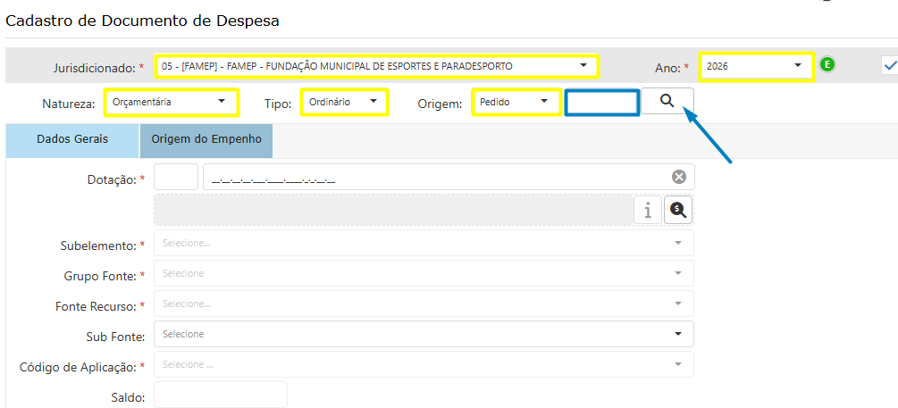 Entre na tela de realização de empenho: Menu > despesa > documento de despesa