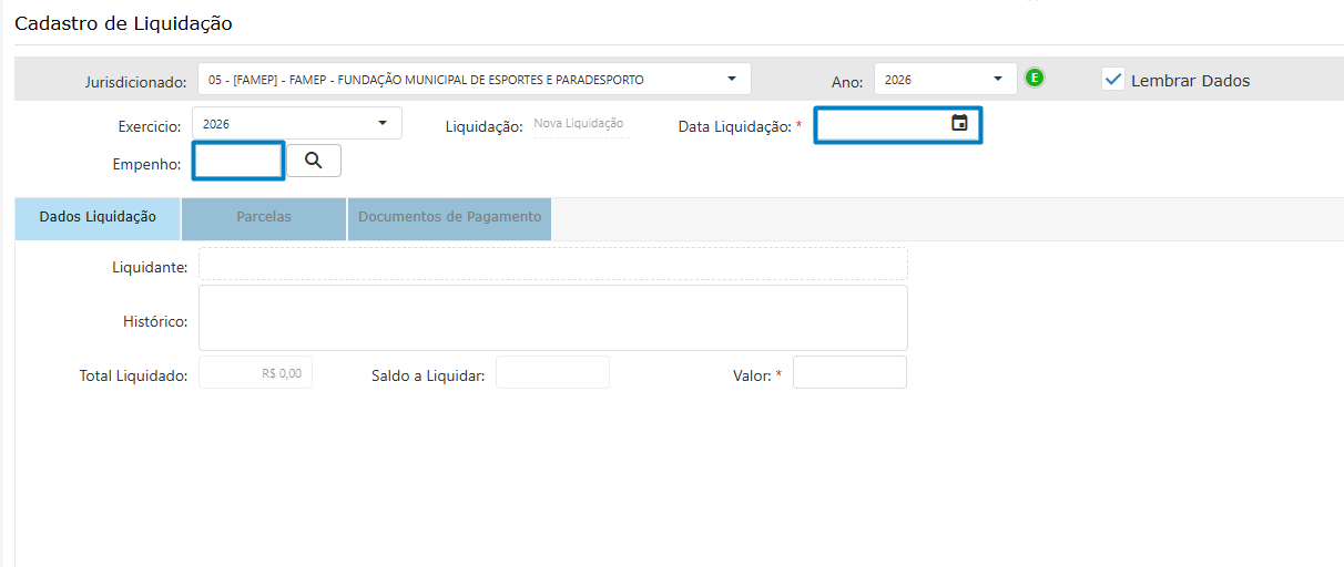 Preencha os campos: Data da liquidação e empenho. Clique em "Tab"