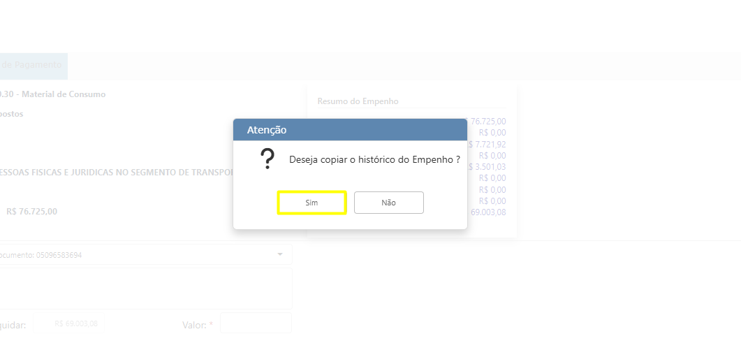 Clique em "SIM" para copiar o histórico já cadastrado no empenho