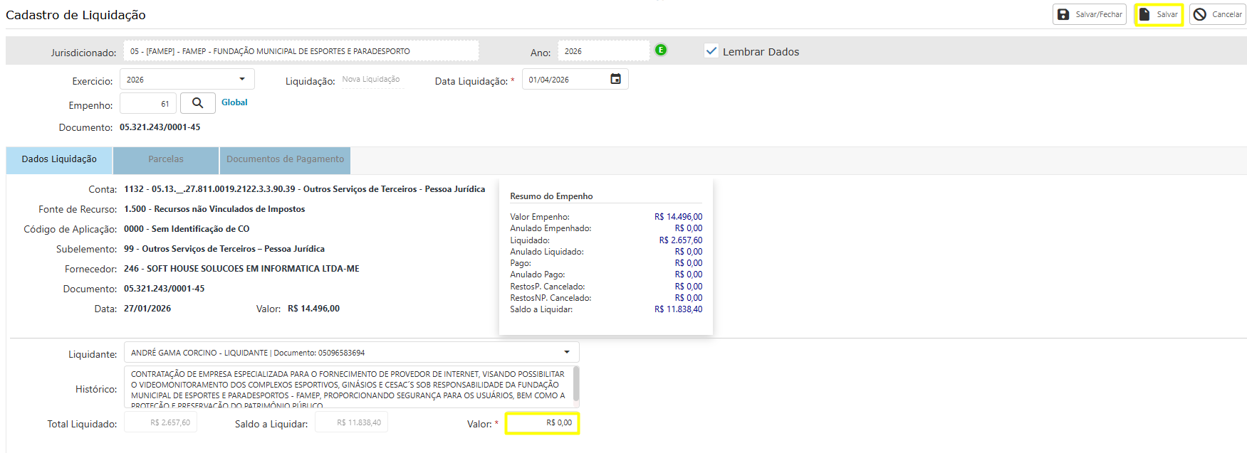Preencha o valor a ser liquidado no campo "Valor", clique em "Salvar"